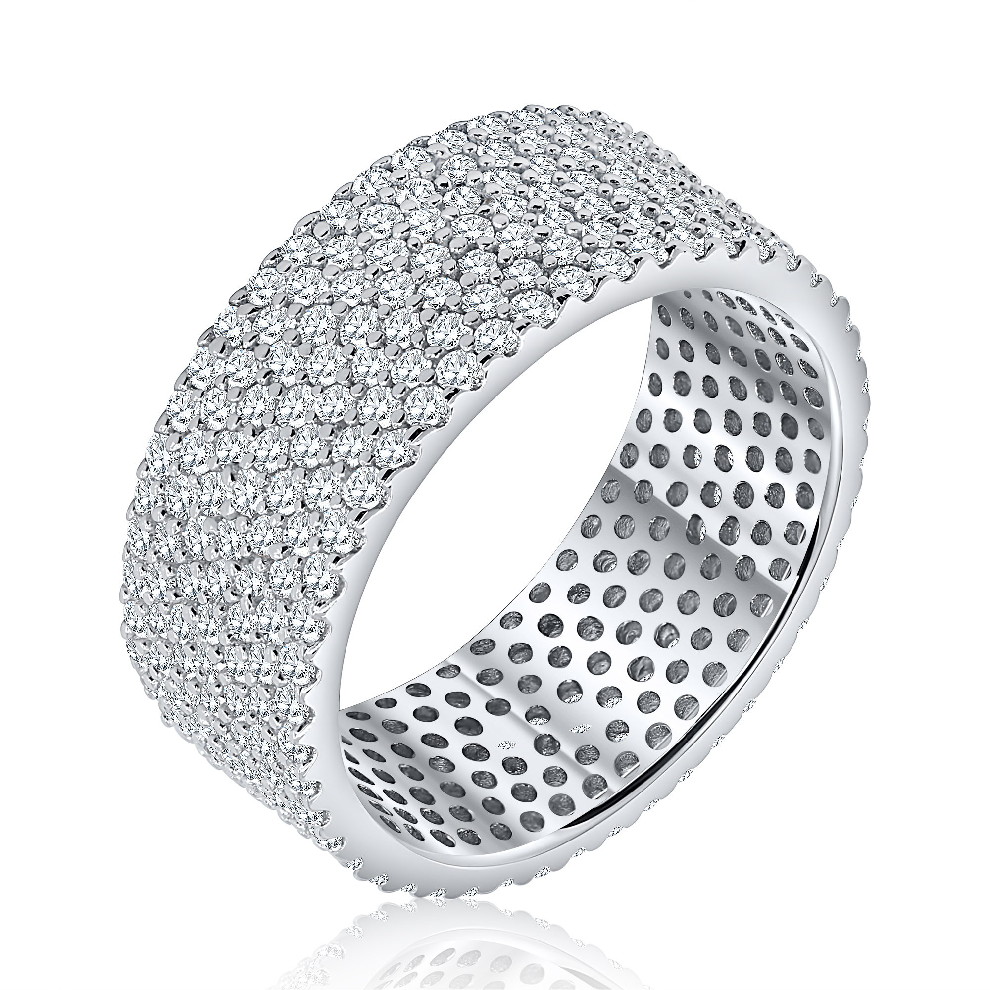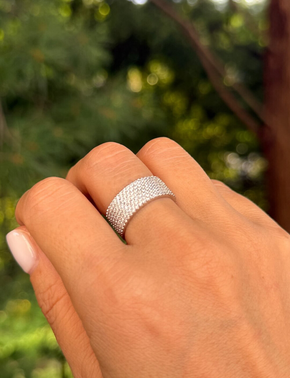 단 하나의 링만으로도 압도적인 존재감을 보여주는 풀 파베 와이드 링입니다. 촘촘하게 세팅된 제트 같은 광택의 큐빅들이 손끝을 움직일 때마다 강렬한 반짝임을 선사하며 럭셔리한 무드를 완성해줍니다.