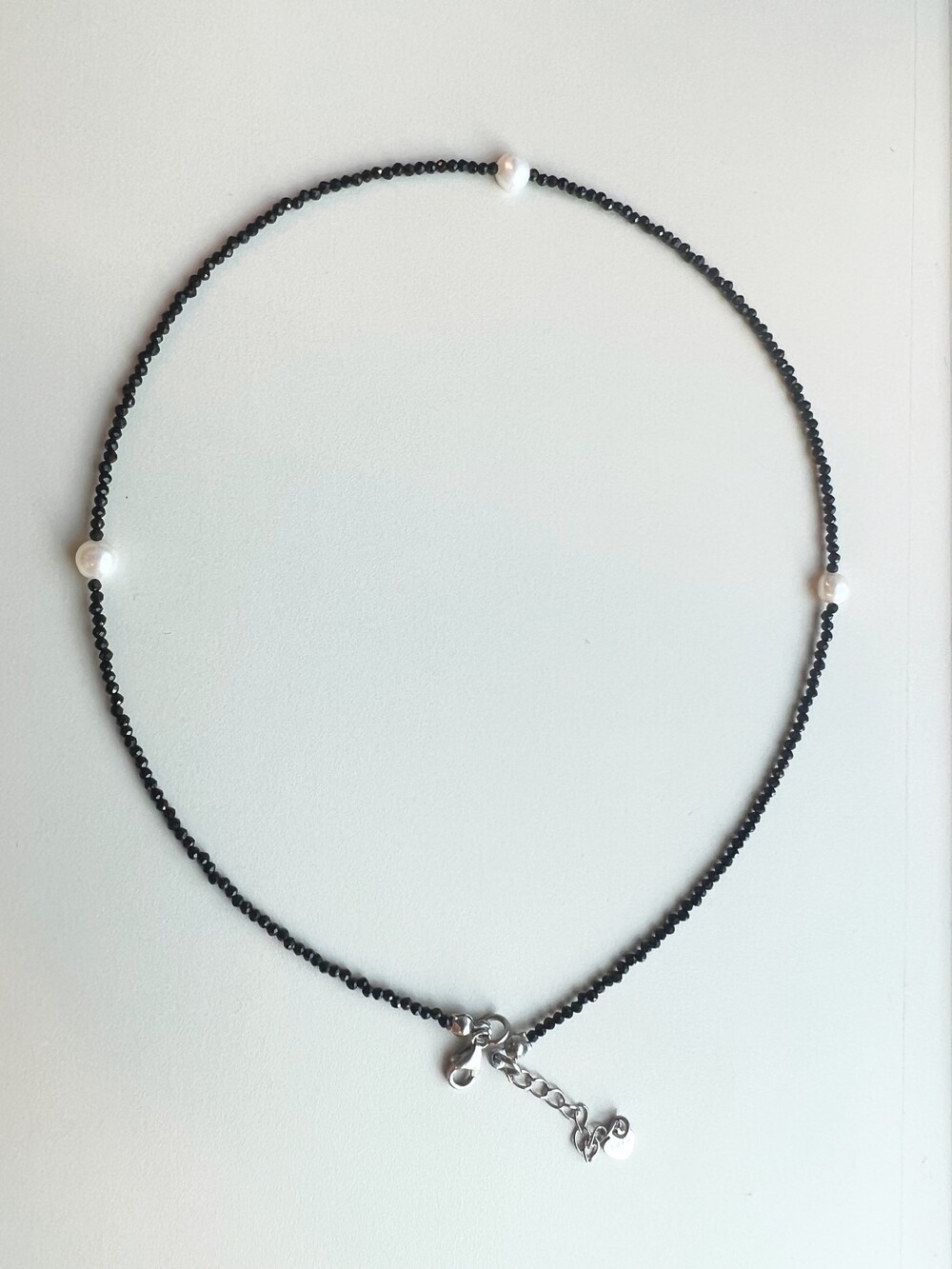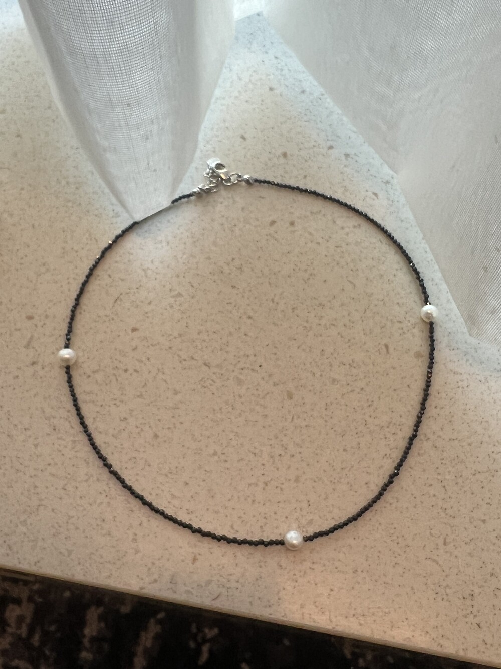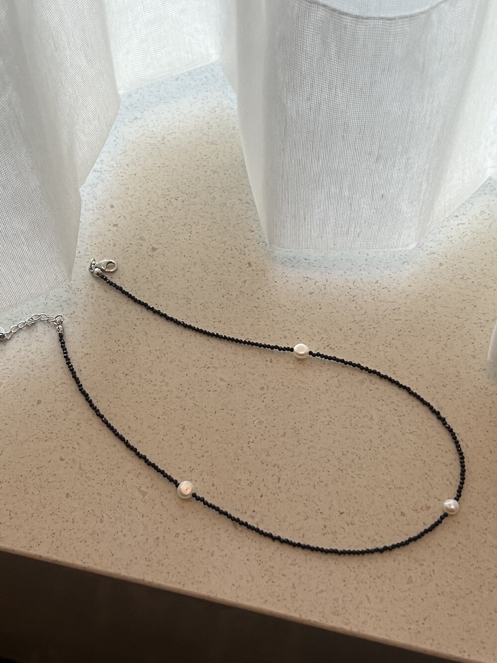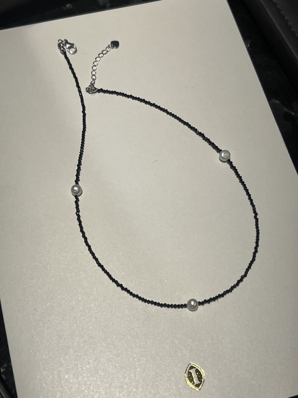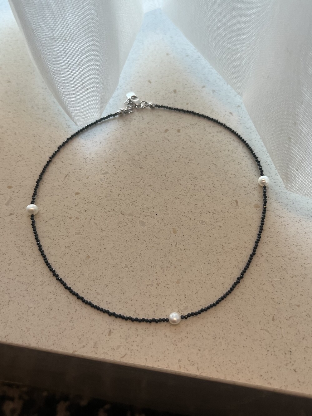 블랙스피넬 원석, A급 담수진주, 길이 조절이 가능한 체인(3cm), 실버(OR도금) 클래스프로 잠그는 형식.