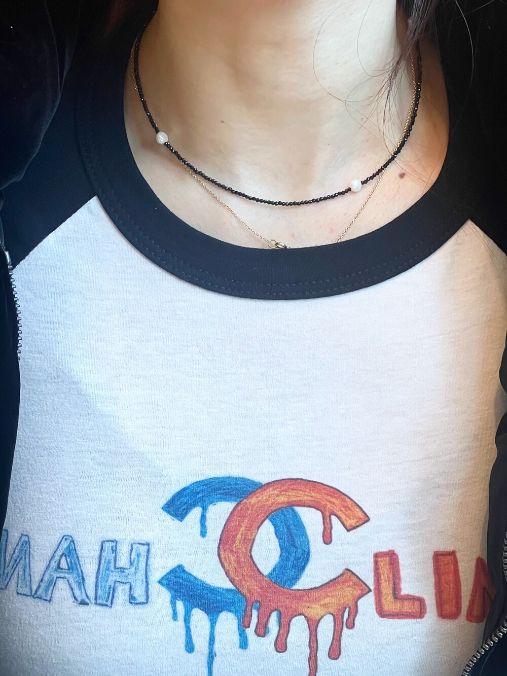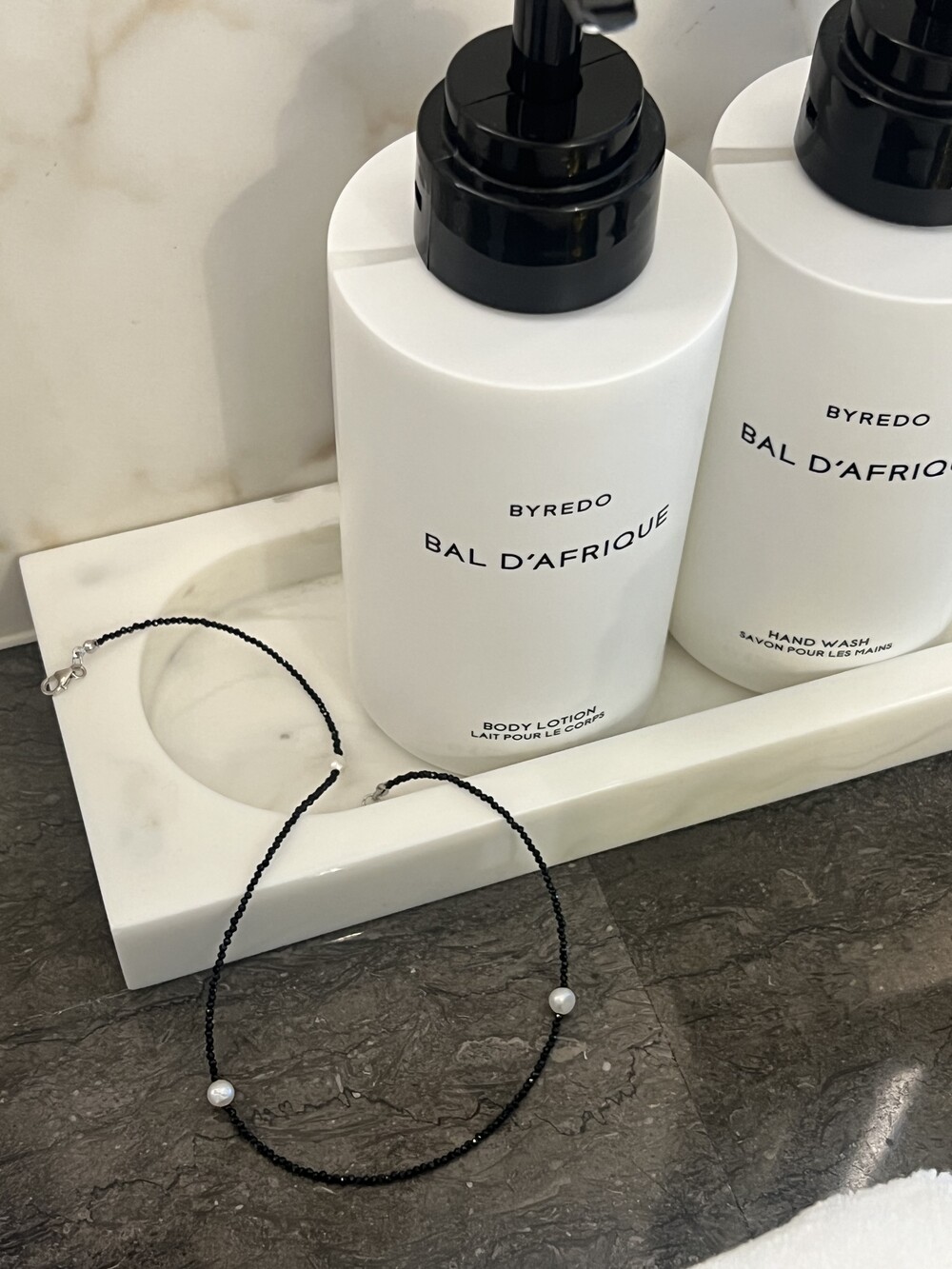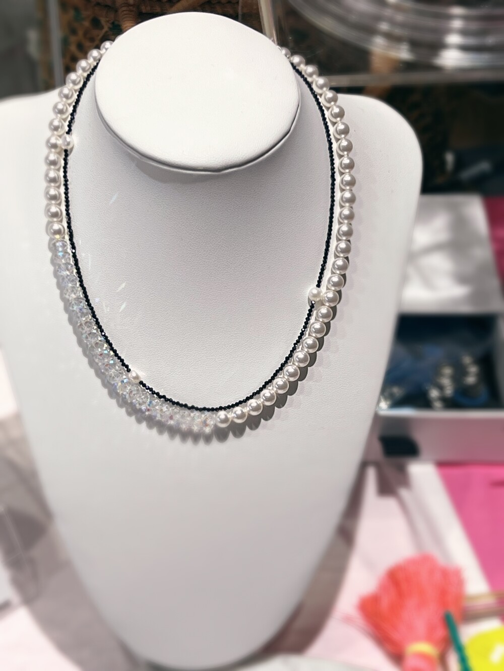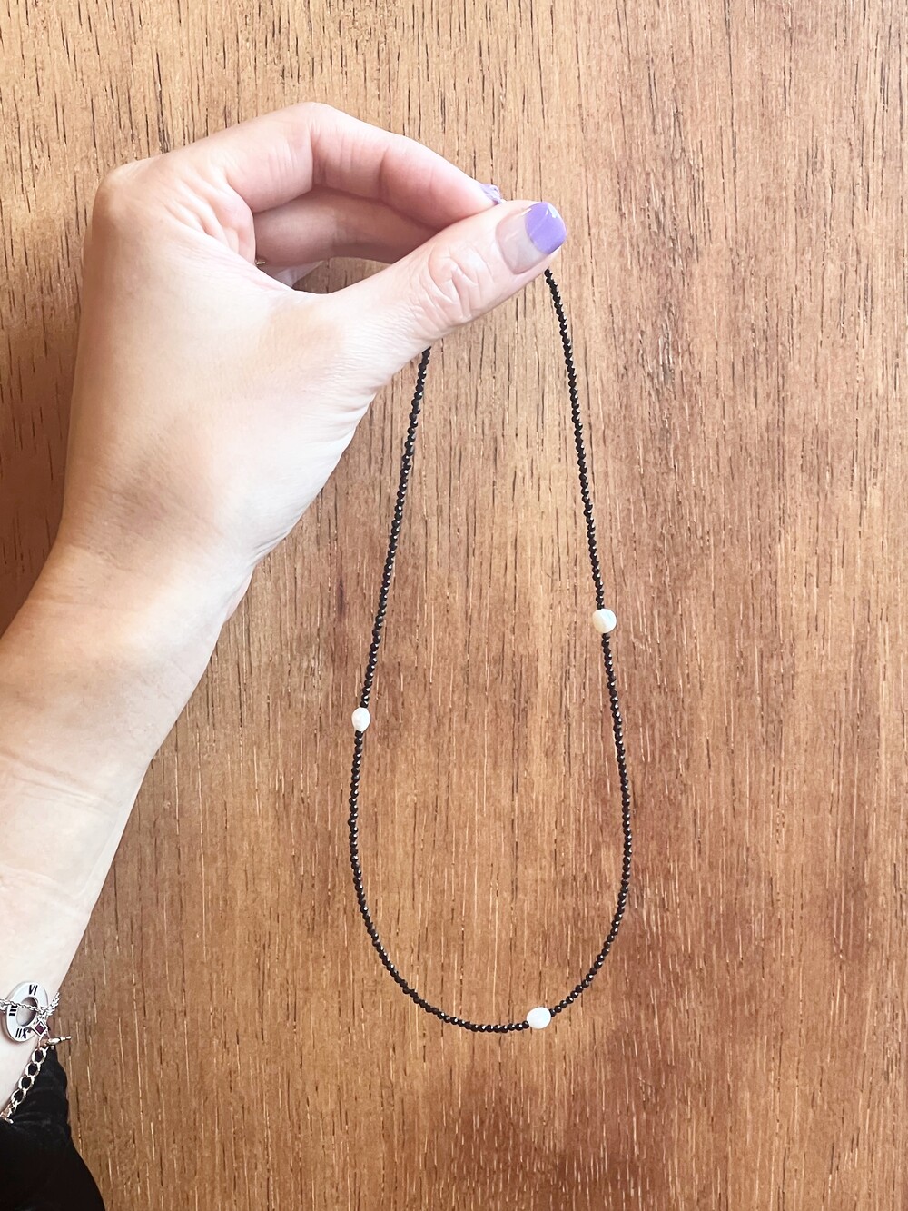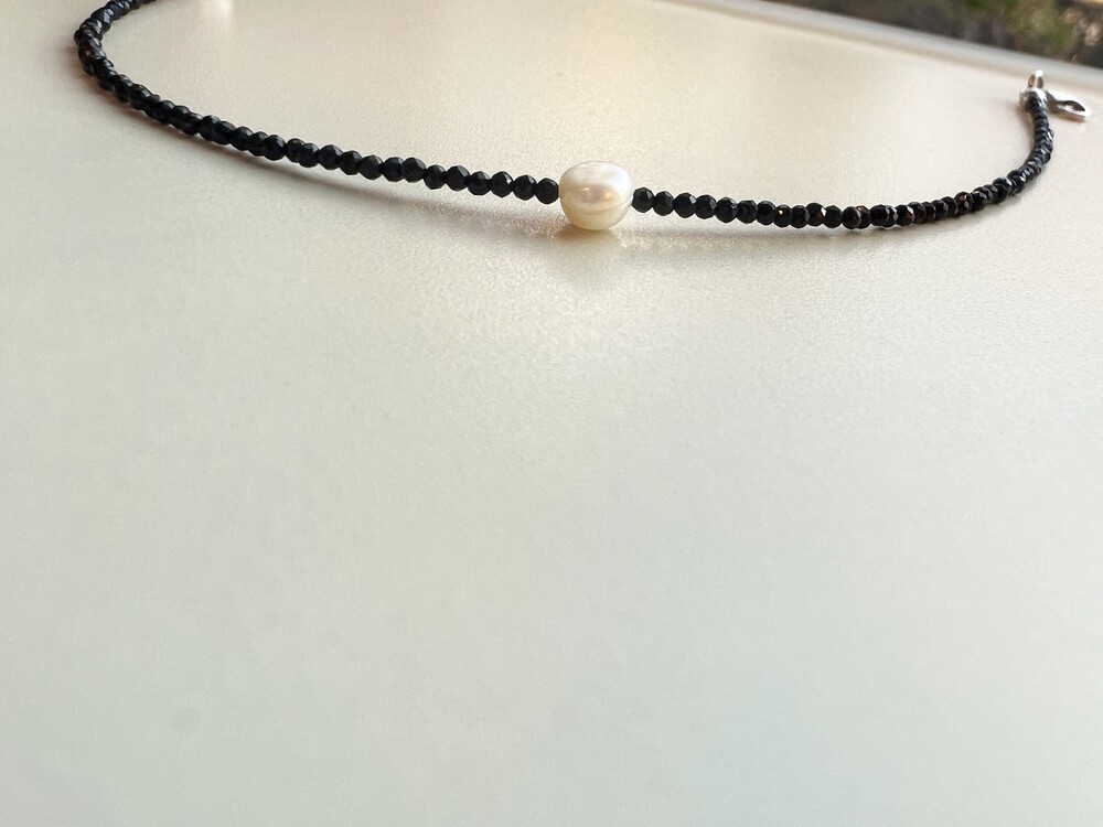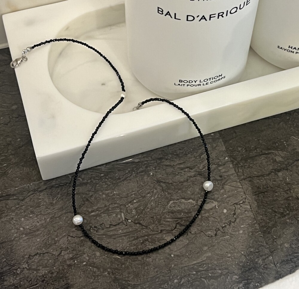 블랙스피넬 원석, A급 담수진주, 길이 조절이 가능한 체인(3cm), 실버(OR도금) 클래스프로 잠그는 형식.