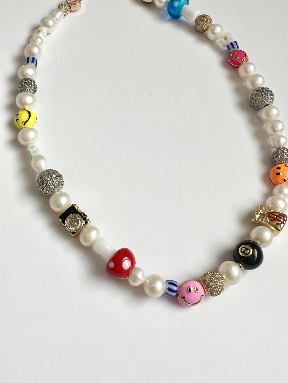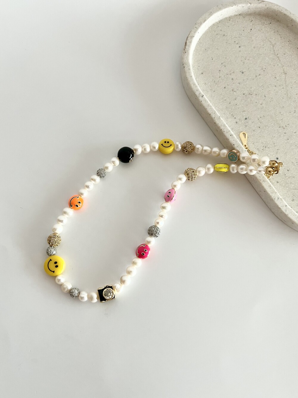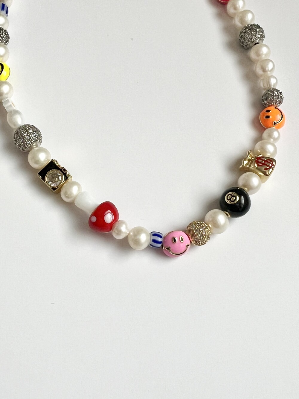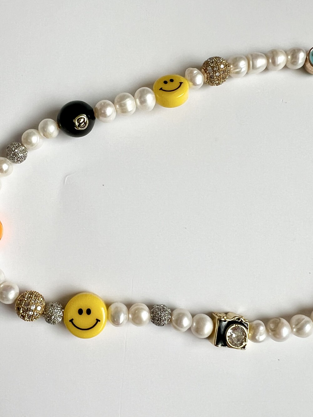오른쪽 목걸이에는 스마일, 카메라, 당구공, 지갑 모양의 에나멜 비즈와