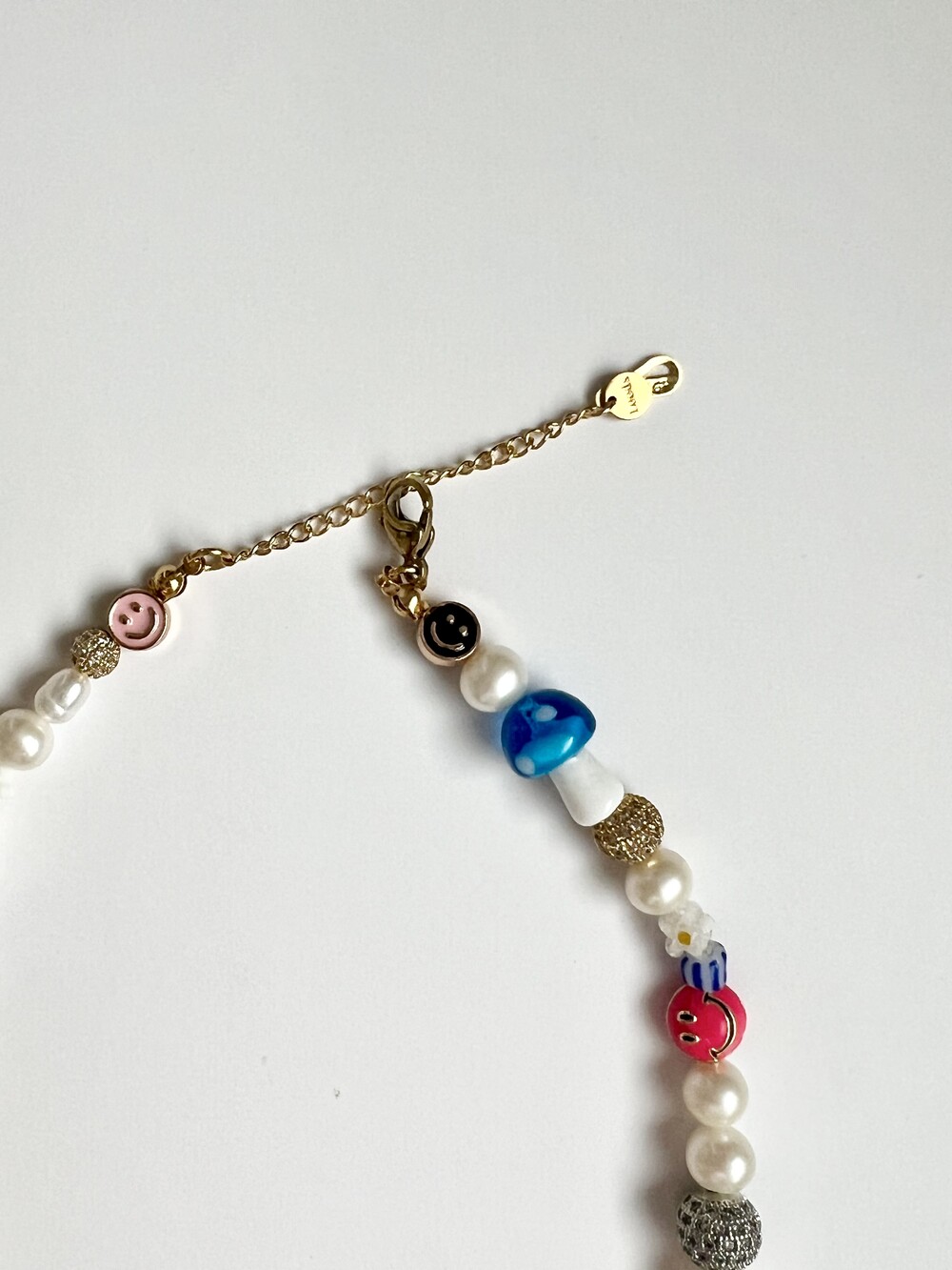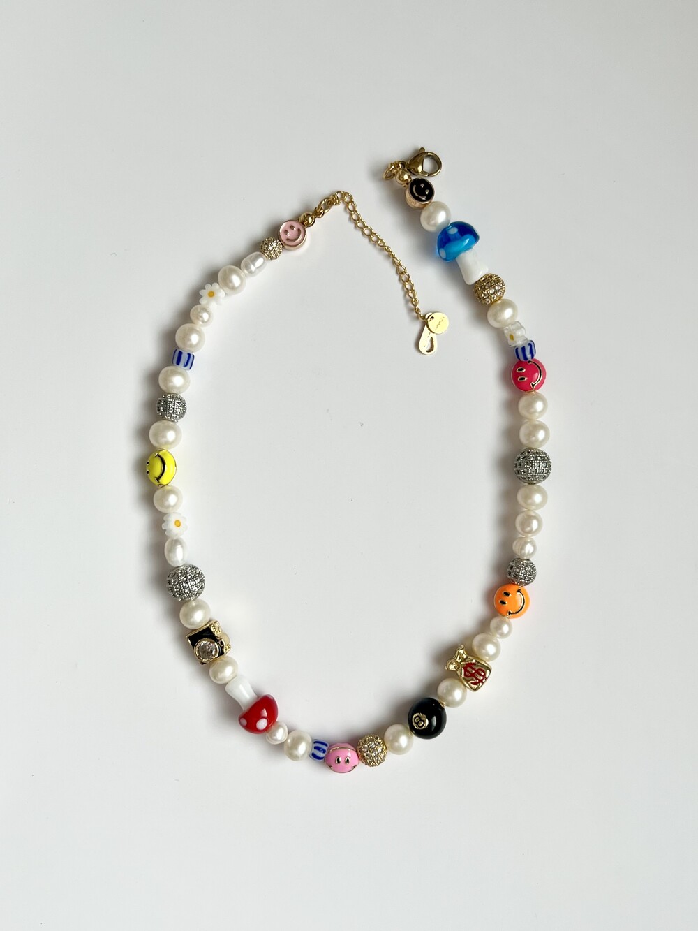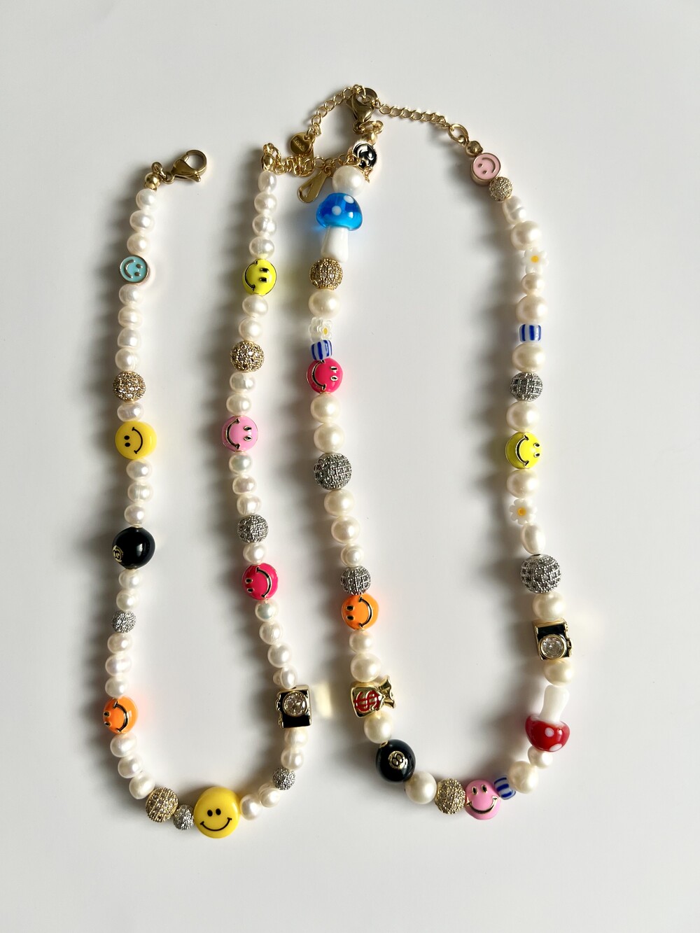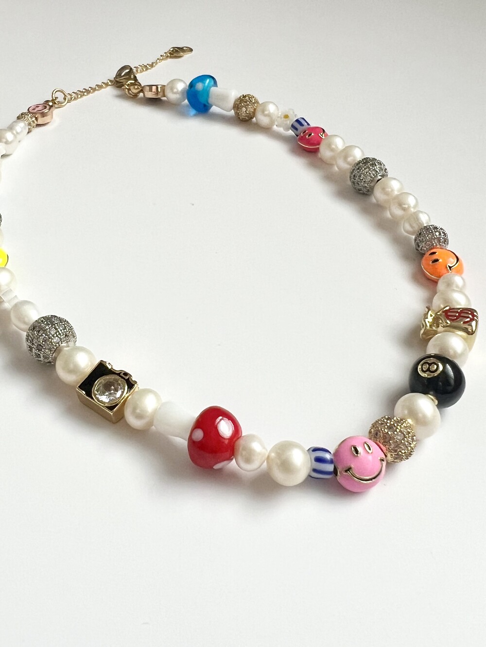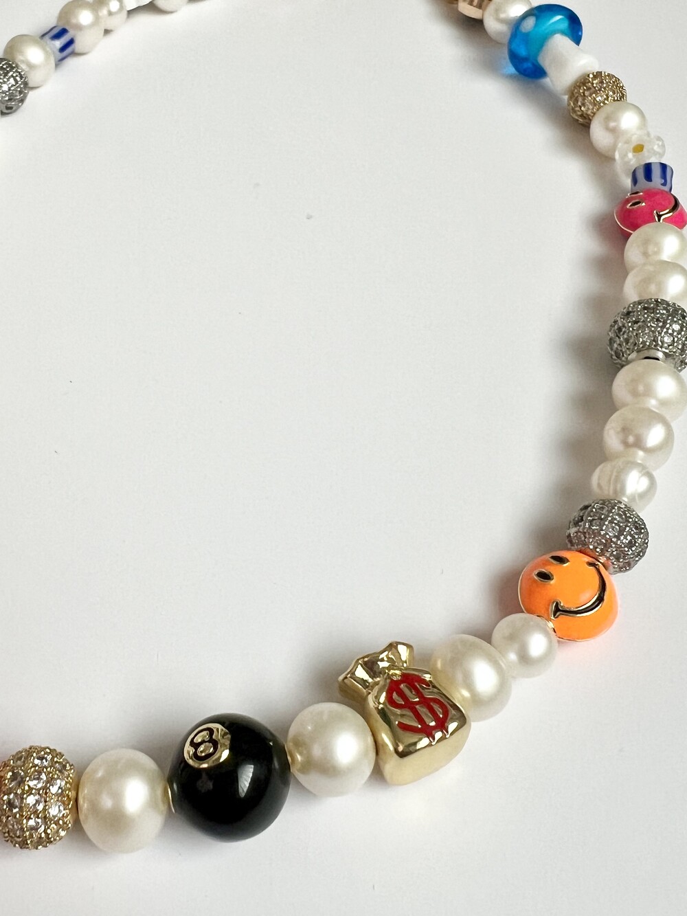 오른쪽 목걸이에는 스마일, 카메라, 당구공, 지갑 모양의 에나멜 비즈와