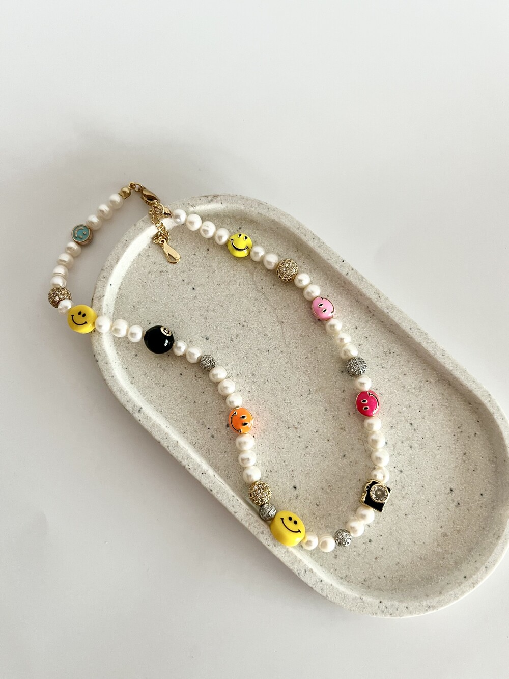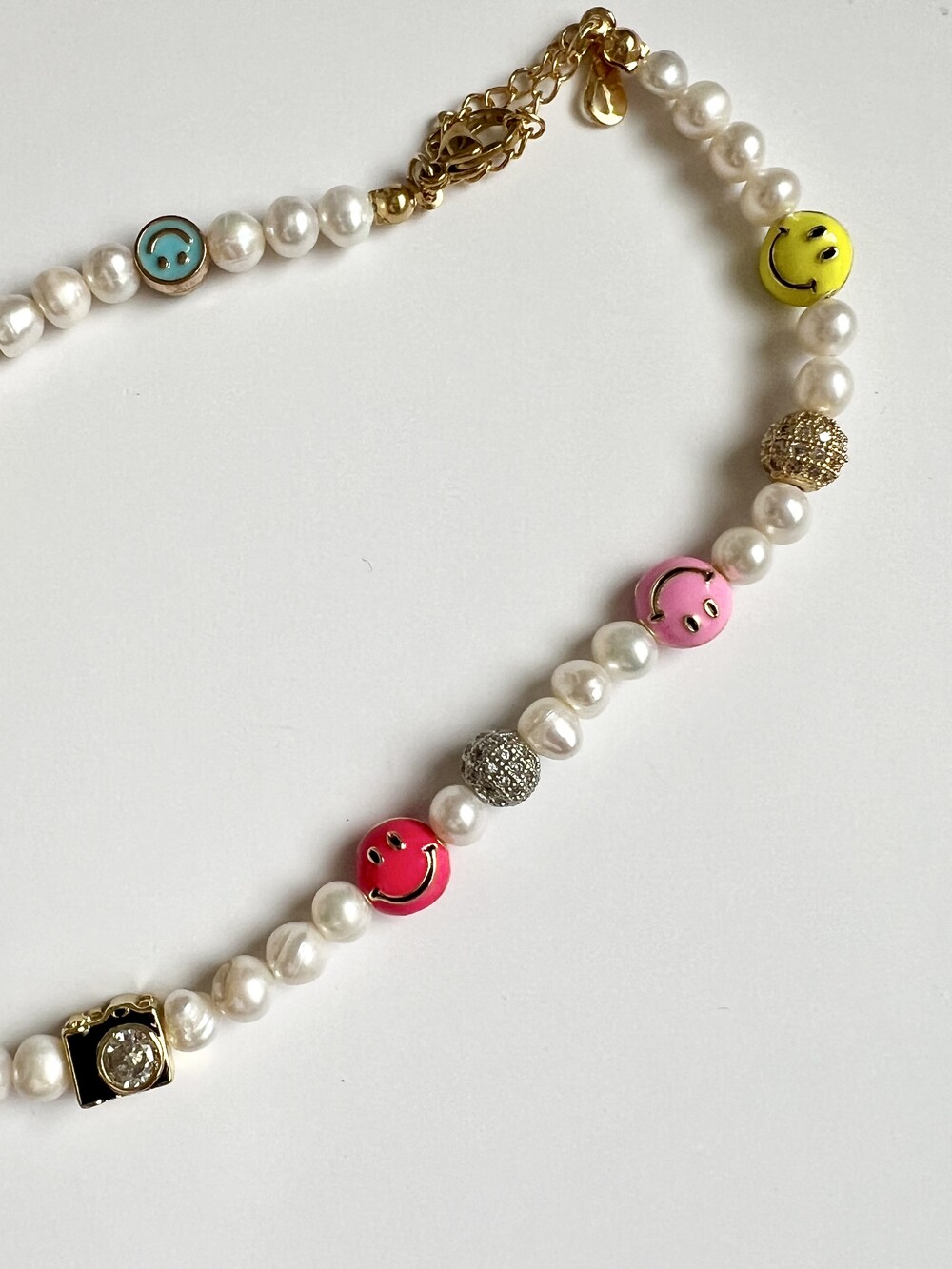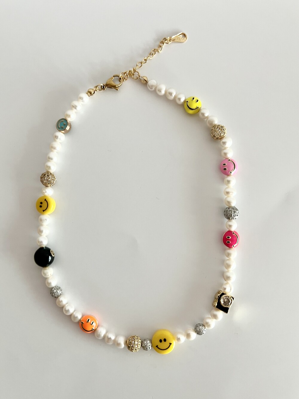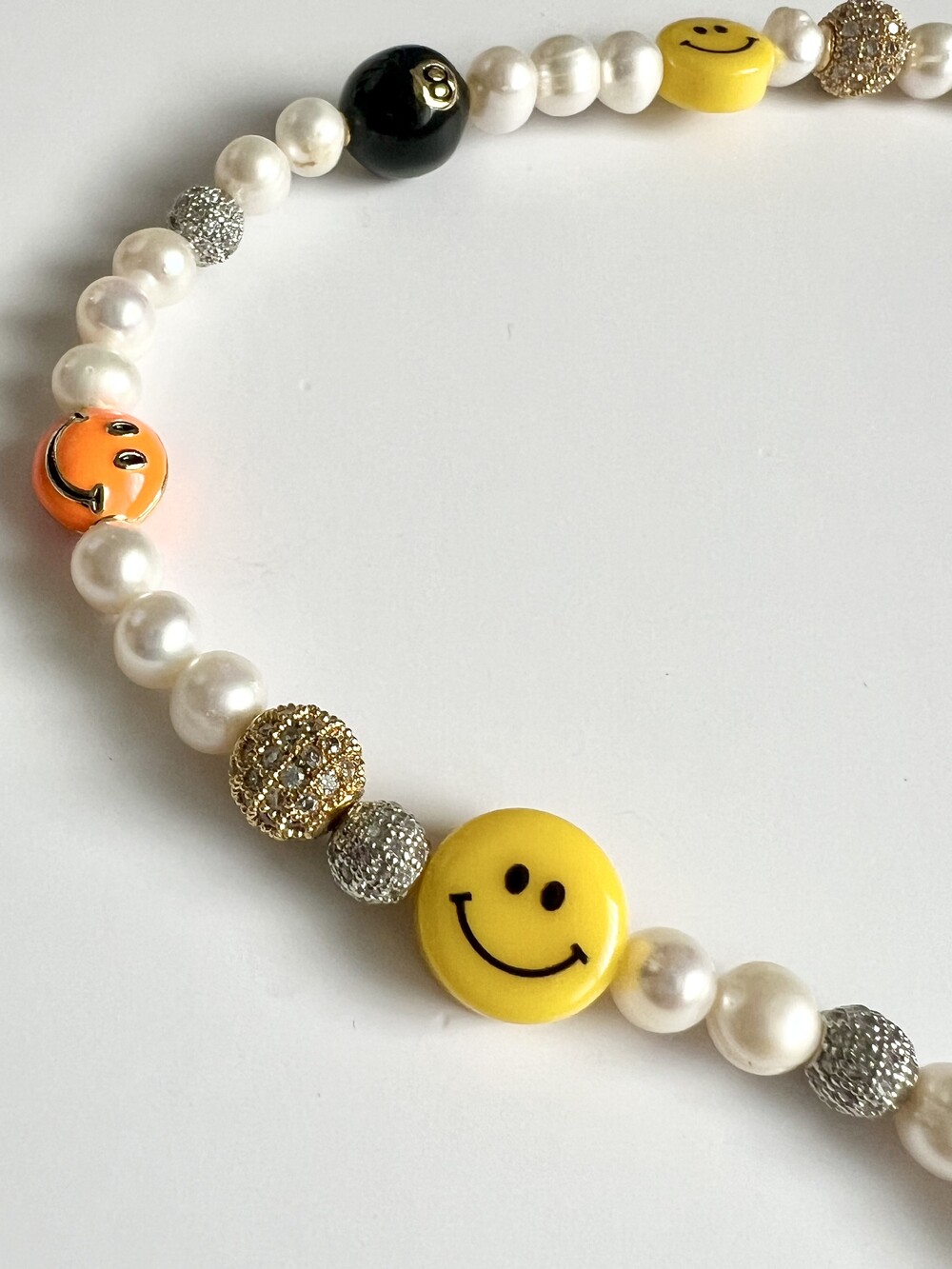 오른쪽 목걸이에는 스마일, 카메라, 당구공, 지갑 모양의 에나멜 비즈와