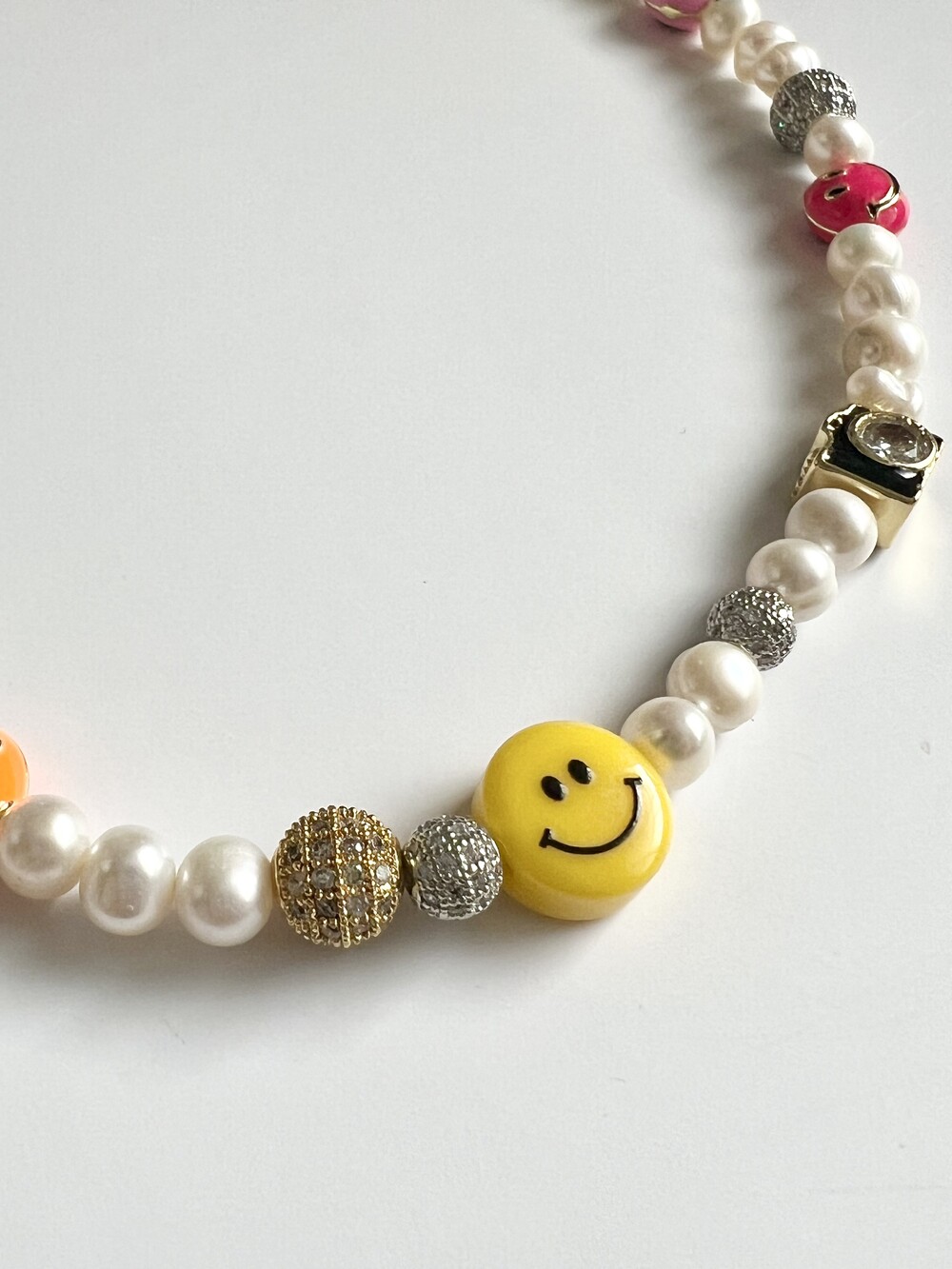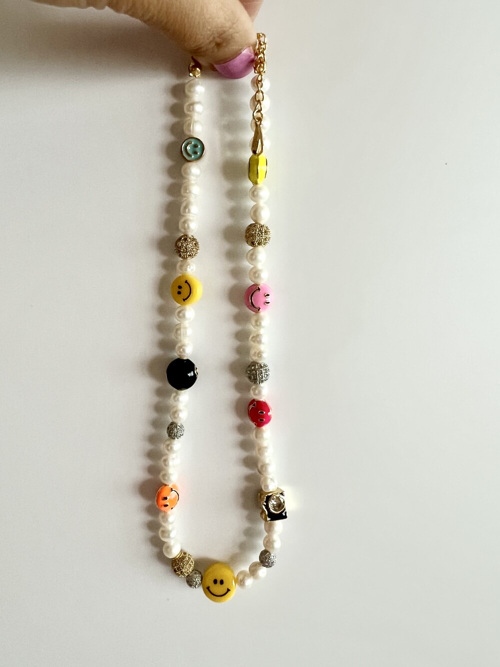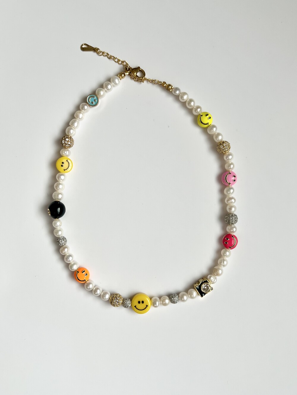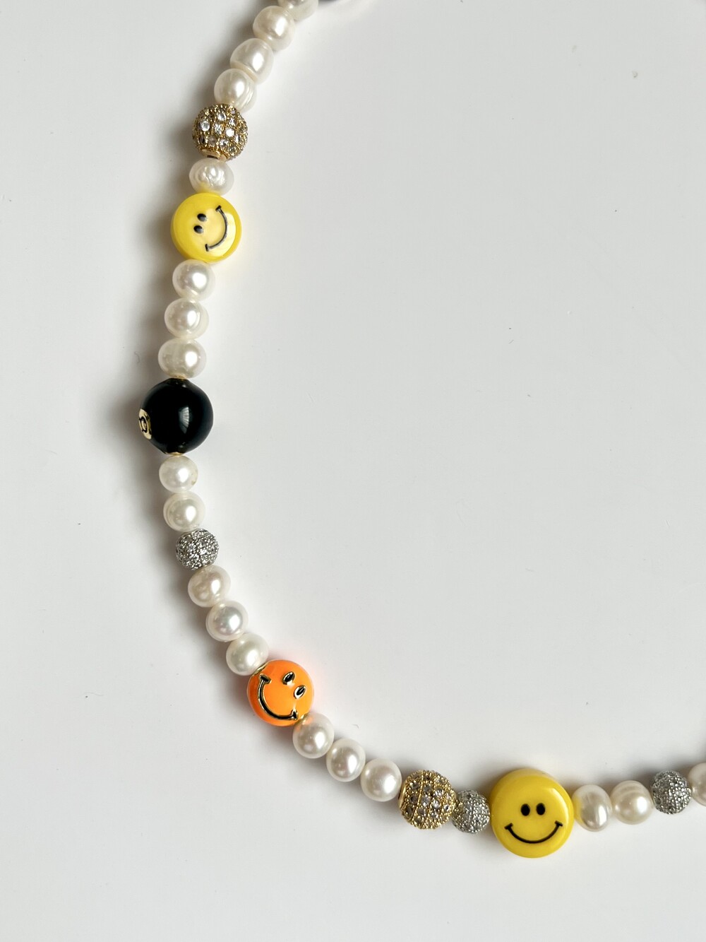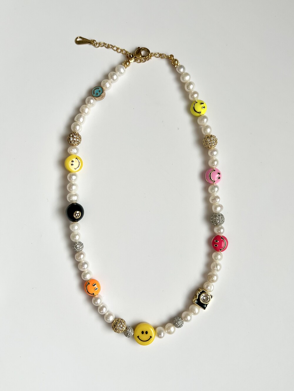 오른쪽 목걸이에는 스마일, 카메라, 당구공, 지갑 모양의 에나멜 비즈와
