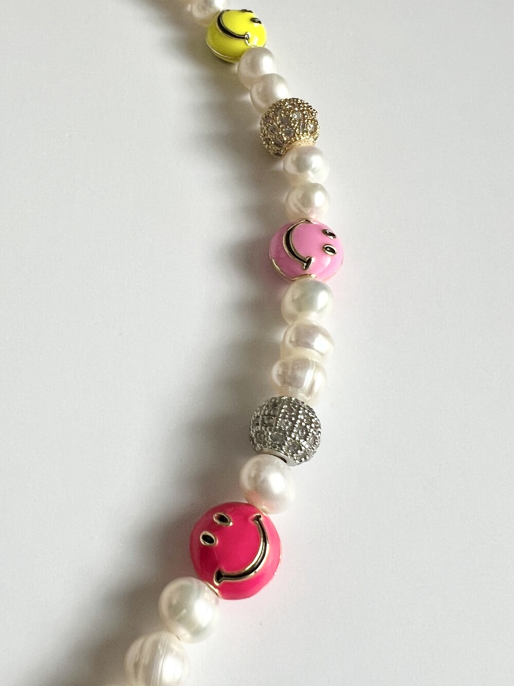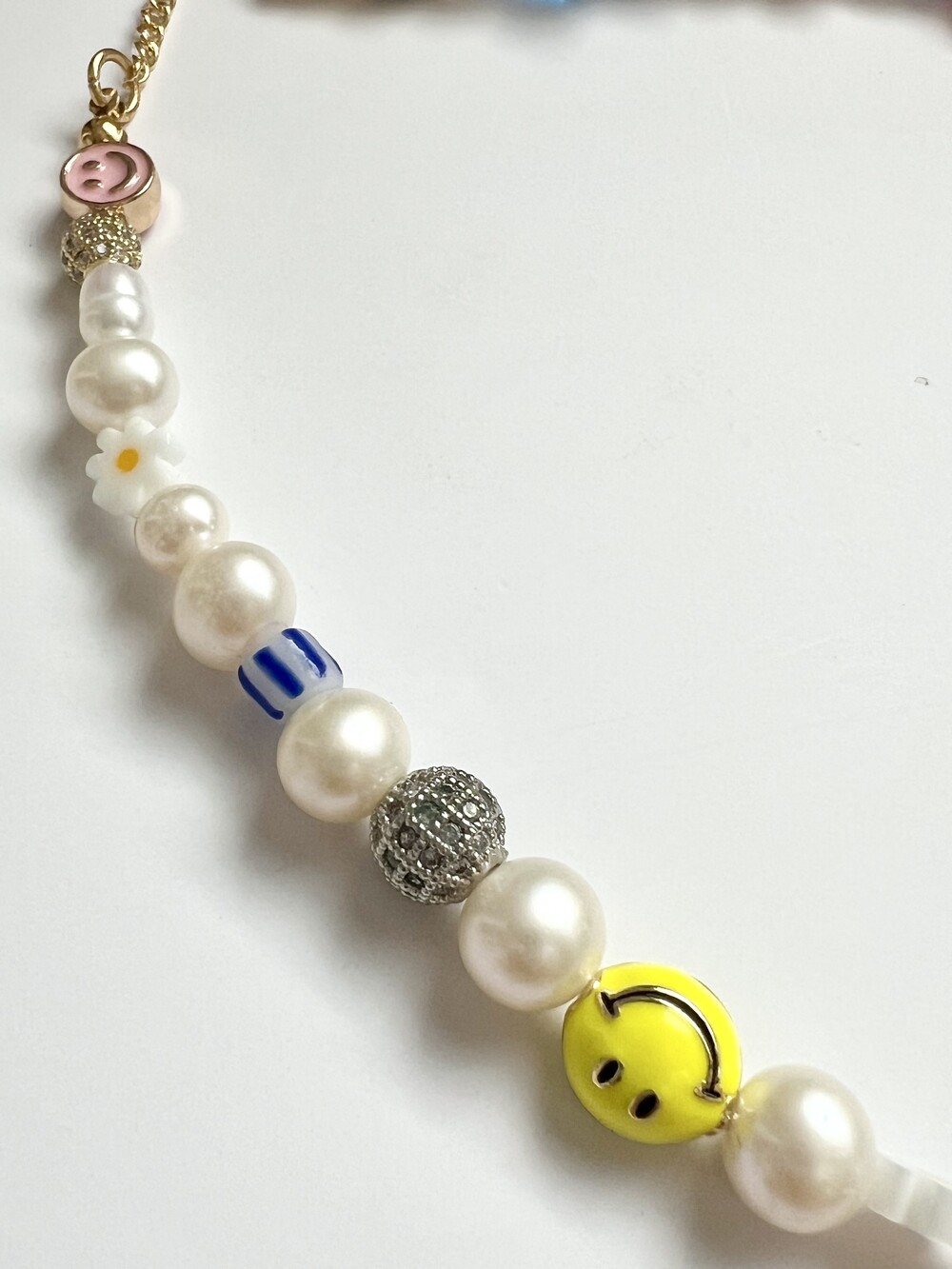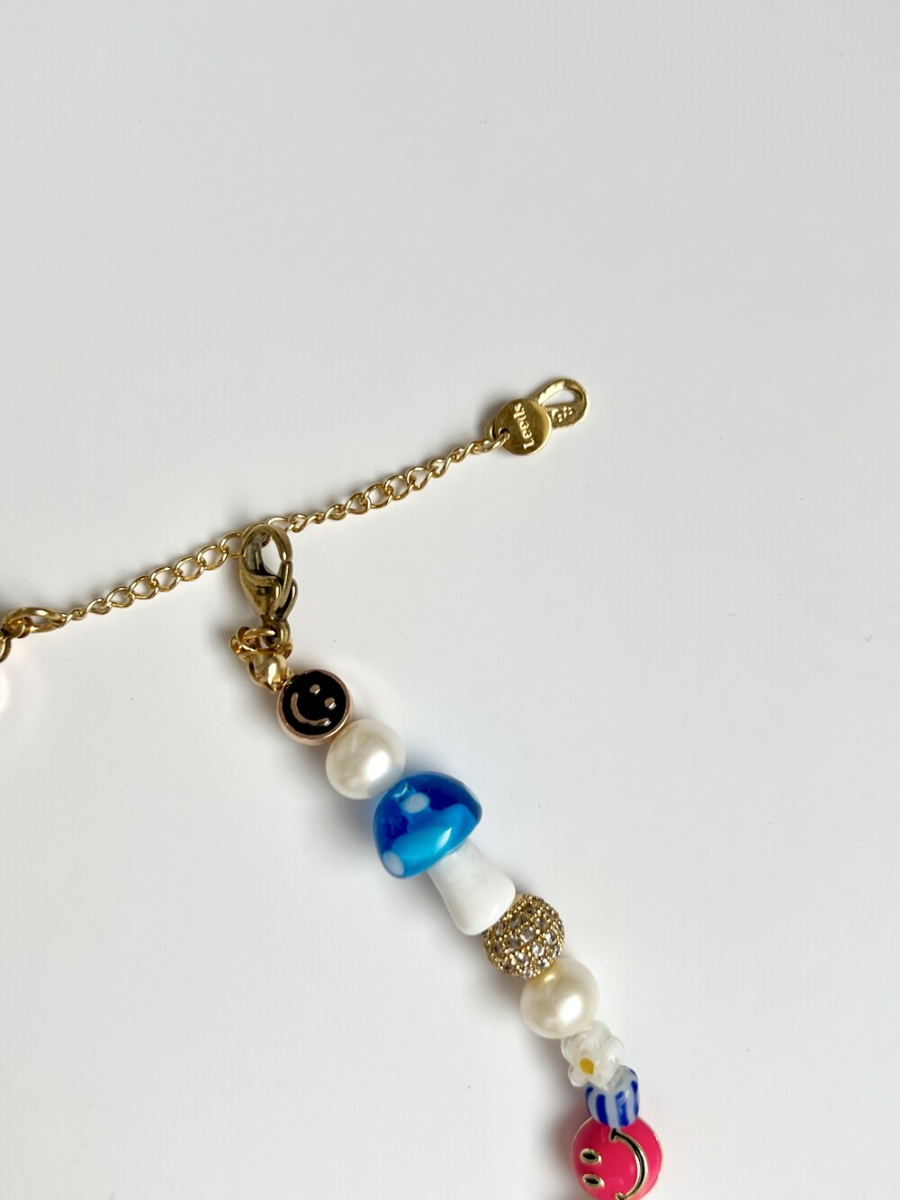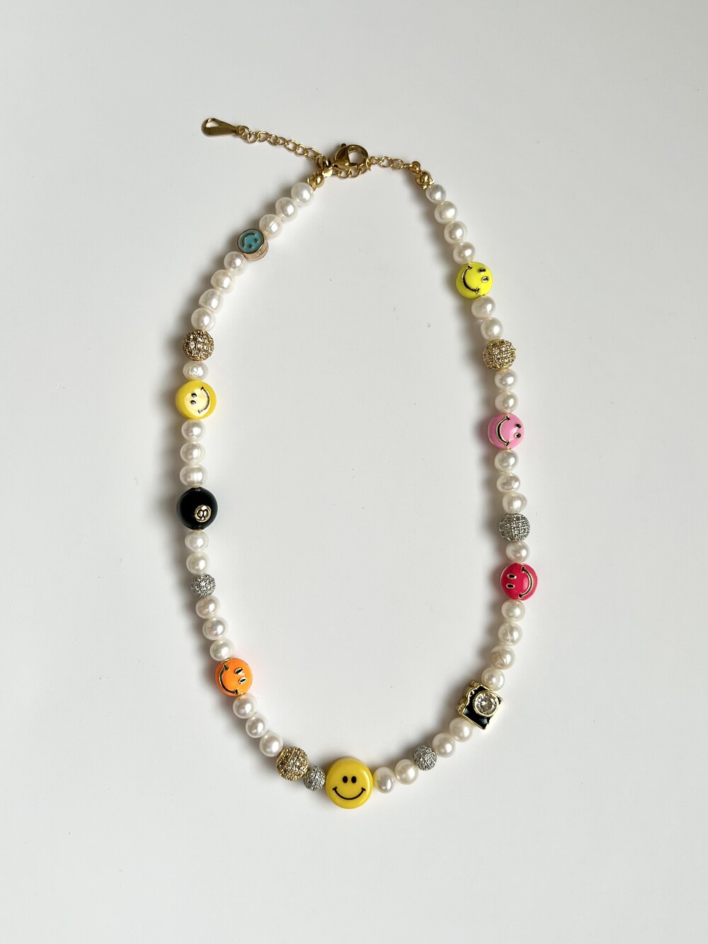 오른쪽 목걸이에는 스마일, 카메라, 당구공, 지갑 모양의 에나멜 비즈와